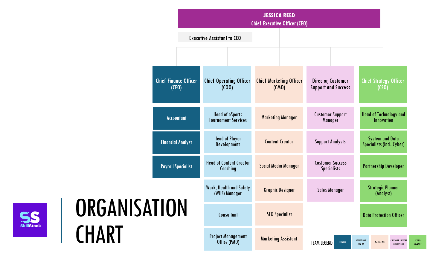 Chief Financial Officer (CFO): Leads the finance team, overseeing the financial health and strategy of SkillStack.